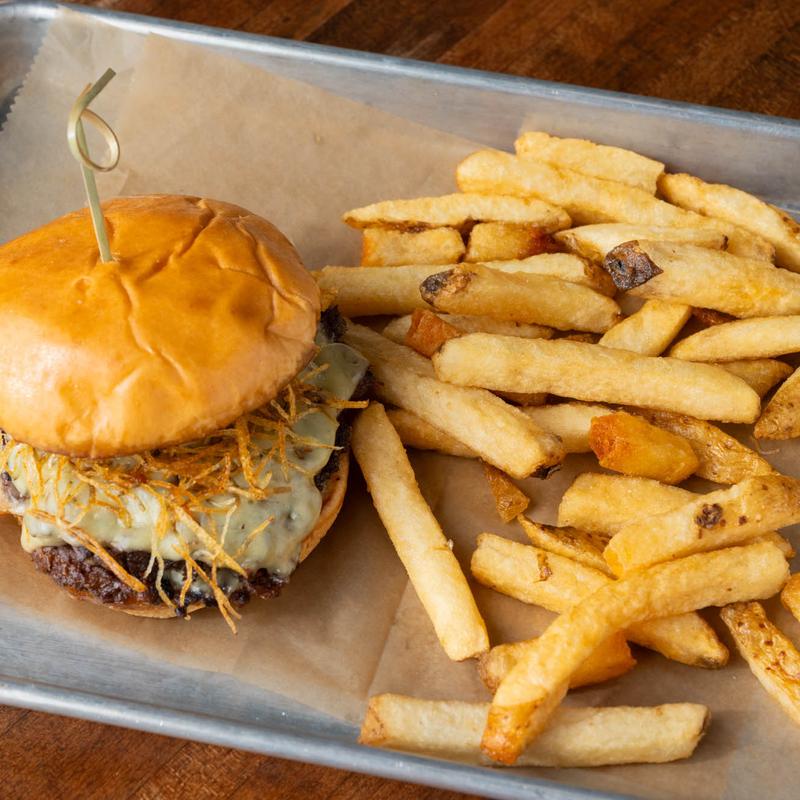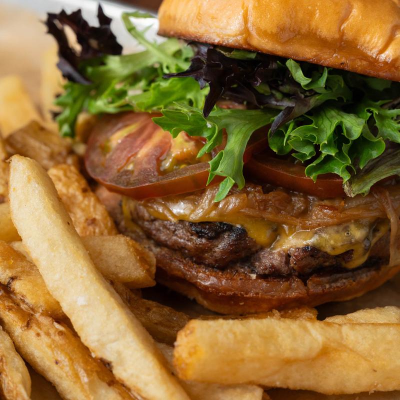6 oz patty, cheddar or Swiss, lettuce, heirloom tomato, caramelized onion, Russian dressing, pickles, brioche