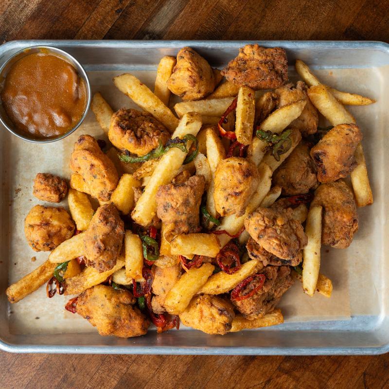 chicken goujons or fried shrimp, onions, peppers, house cut fries, Irish curry sauce