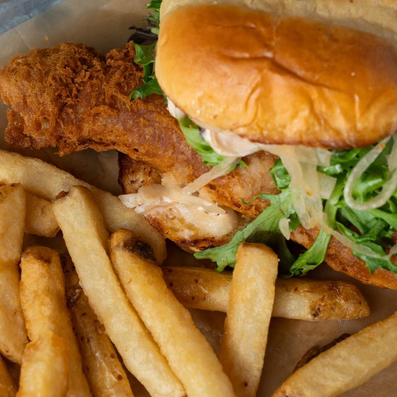 beer battered haddock, lettuce, malt pickled onions, chili tartar, brioche bun